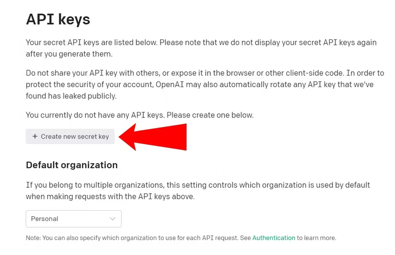On this page, you'll find the "Create new secret key" button. If you don't have an API key yet, click this button to create one. Remember to save your API key immediately, as you cannot retrieve it once the window is closed.