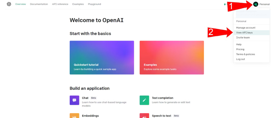 Follow the numbered red arrows on OpenAI's website to locate the page for generating an API Key.